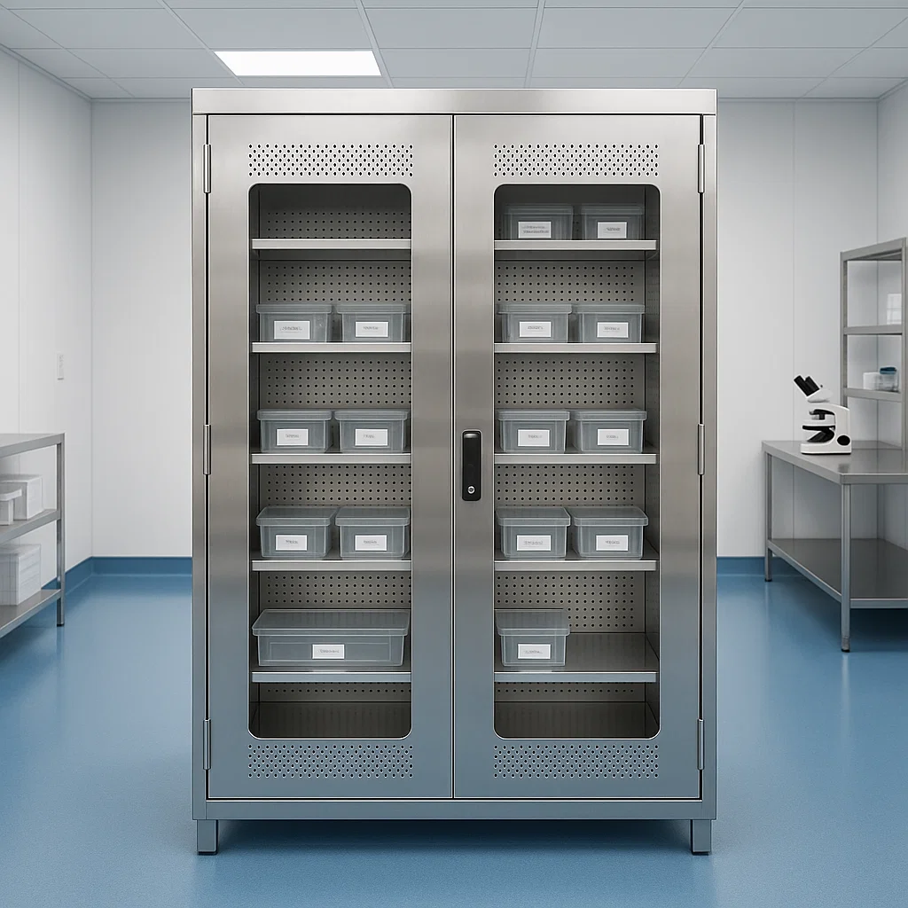 The Storage Cabinet provides secure storage for cleanroom materials and equipment, ensuring that they are kept organized and easily accessible. Its stainless steel construction ensures durability and easy maintenance in sterile environments.